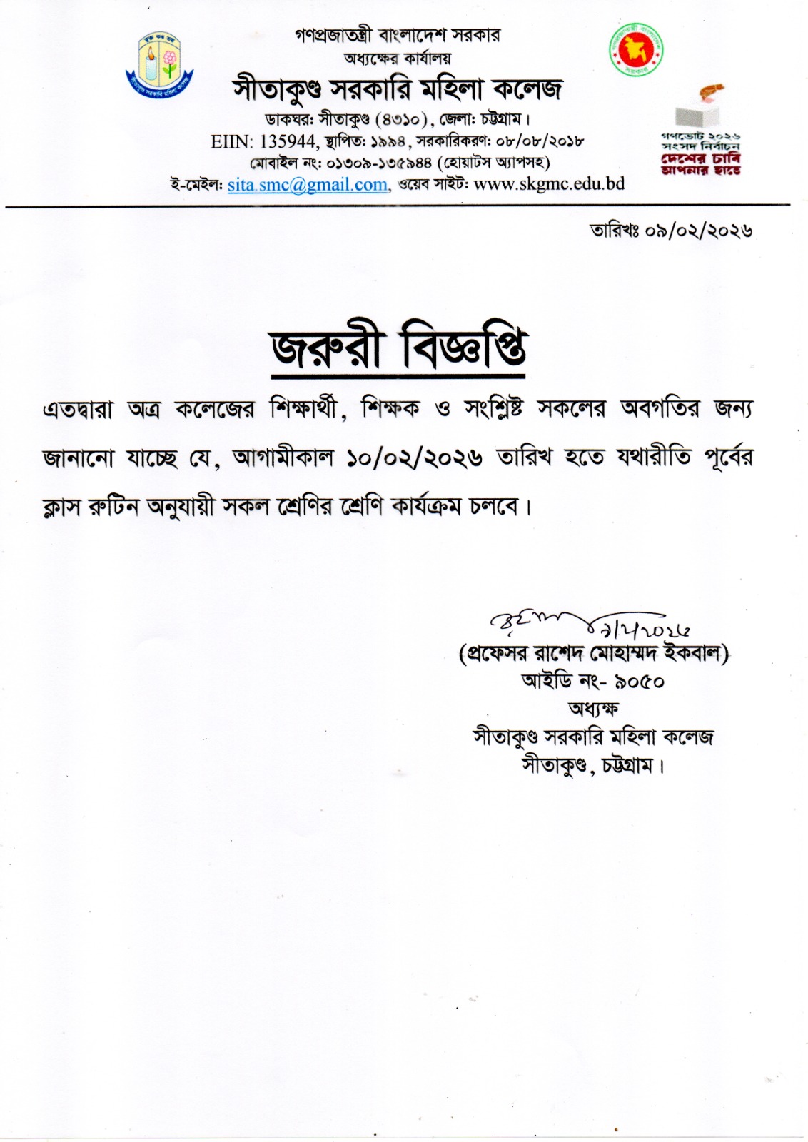 আগামীকাল ১০/০২/২০২৬ তারিখ সকল শ্রেণির শ্রেণি কার্যক্রম চালু সংক্রান্ত নোটিশ